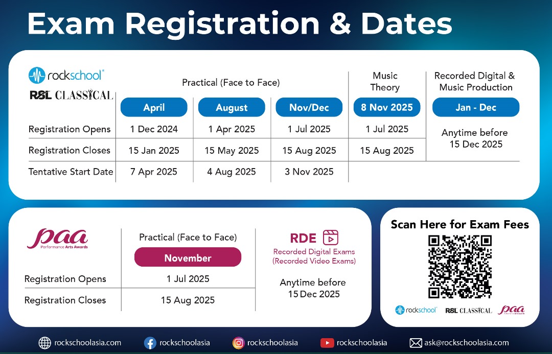 Rockschool Examination Registration Fee Refund Policy: Payment for exam entries are not refundable, returnable, transferable nor exchangeable for cash. Examinations may be deferred to the next examination period with proof of medical emergencies with relevant certification from a medical practitioner.